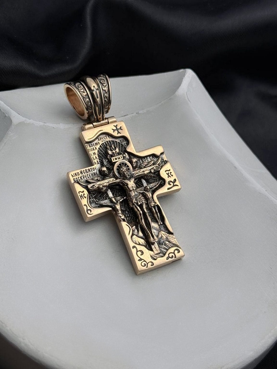 Лицевая сторона (Распятие): Посвящена традиционному каноническому образу Распятия Христова. Фигура Спасителя выполнена с высокой анатомической точностью и размещена на фоне сложного орнамента с рельефными надписями.