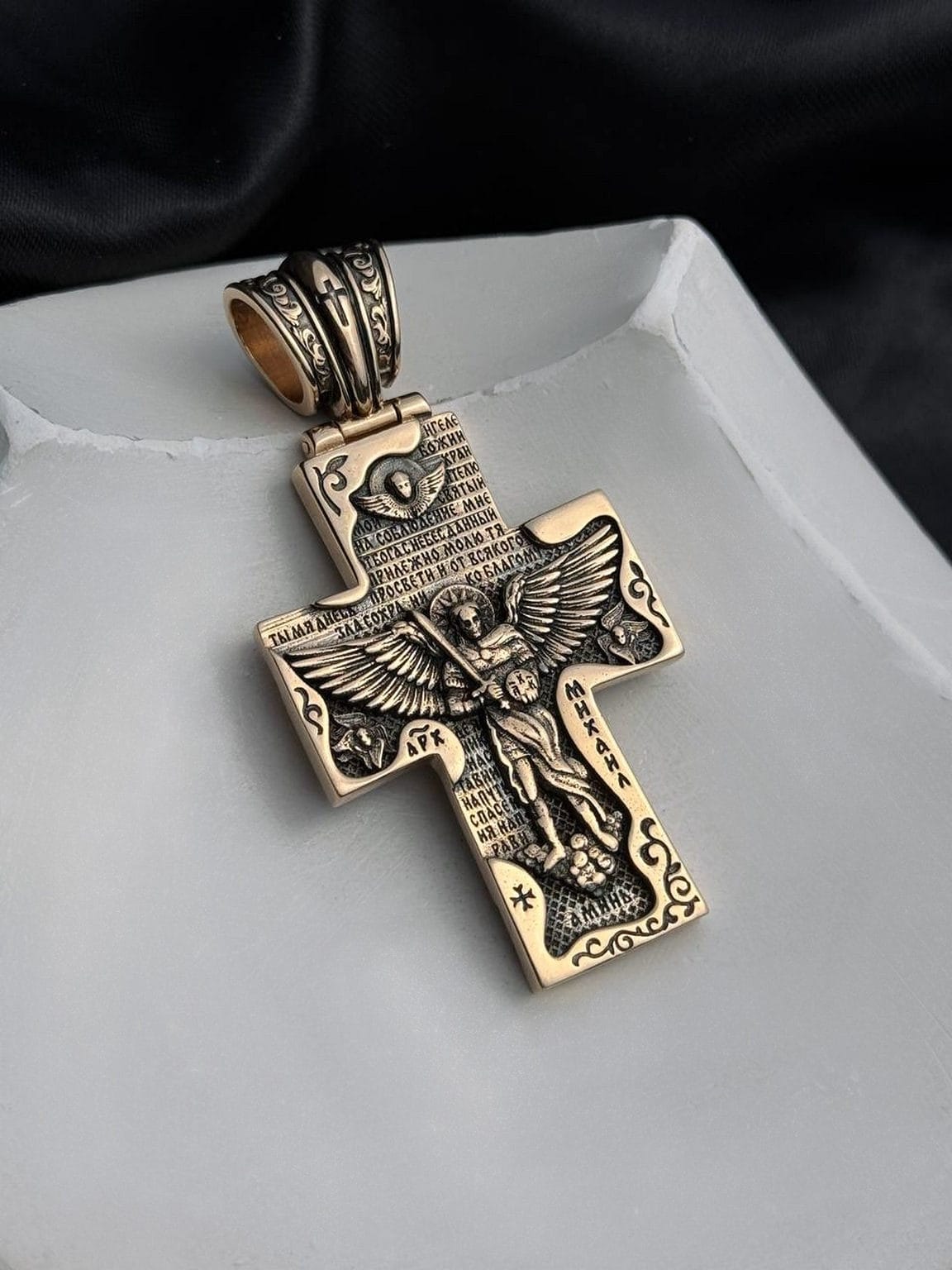 Золотой крест «Архангел Михаил» (арт. 1524) — это монументальный символ веры, отличающийся глубокой детализацией и солидным весом в 31 грамм. Изделие выполнено в формате двустороннего рельефного креста со сложной, многослойной архитектурой.
